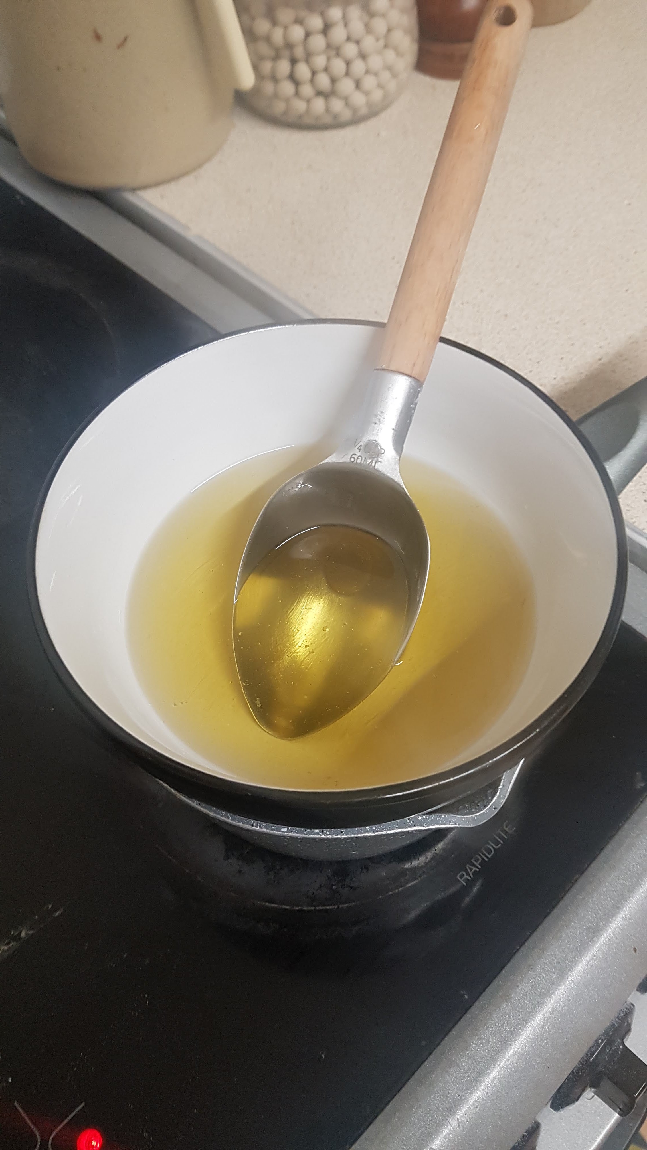 #1 Set a small pan of water to heat on the stove, then weigh out equal quantities of coconut oil and shea butter. (I find 80 grams of each gives me enough for my three jars). Using a heat proof bowl, place over the pan of water so you can melt the oil and butter gently.